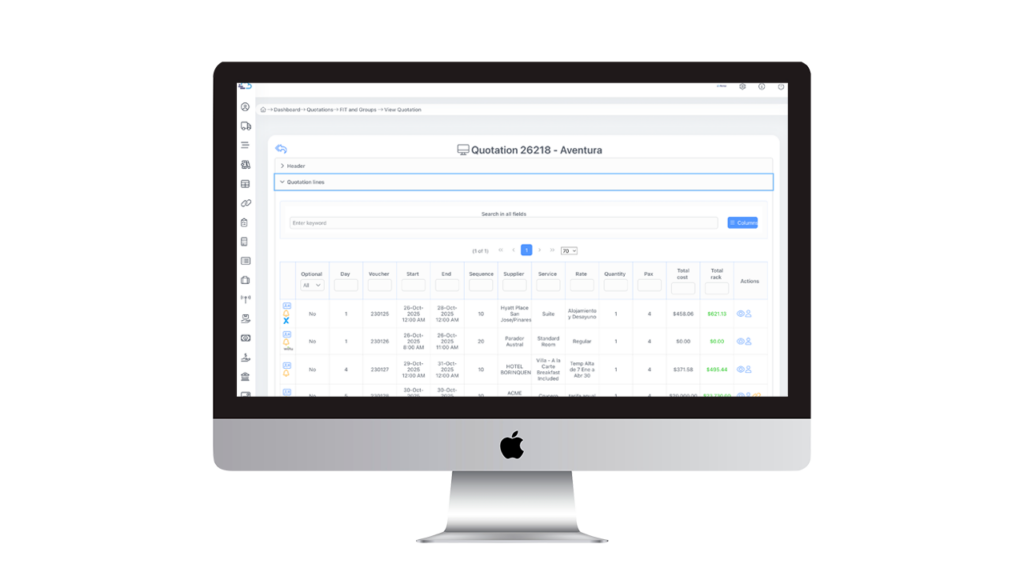 El sistema maneja tanto tarifas netas como comisiones, adaptándose a diferentes estrategias comerciales. Permite configurar márgenes personalizados y tener control total sobre las cotizaciones, ofreciendo varias opciones para cotizar a clientes. Esto proporciona flexibilidad para trabajar con un catálogo de productos más extenso y optimizar la rentabilidad de cada reserva.